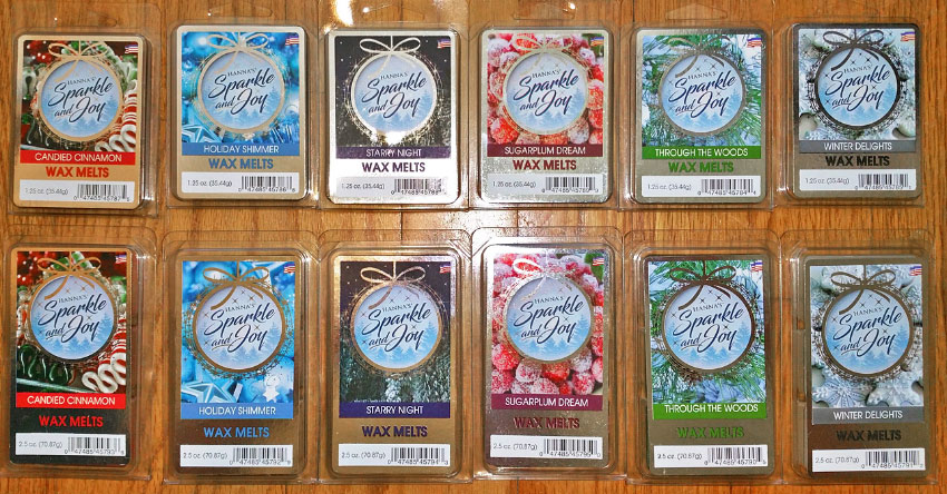 This is a review of Hanna's Candle Christmas Sparkle and Joy Wax Melts (Candlemart). These are available in both regular sized 2.5 oz. melts, as well as smaller 1.25 oz. sized melts.